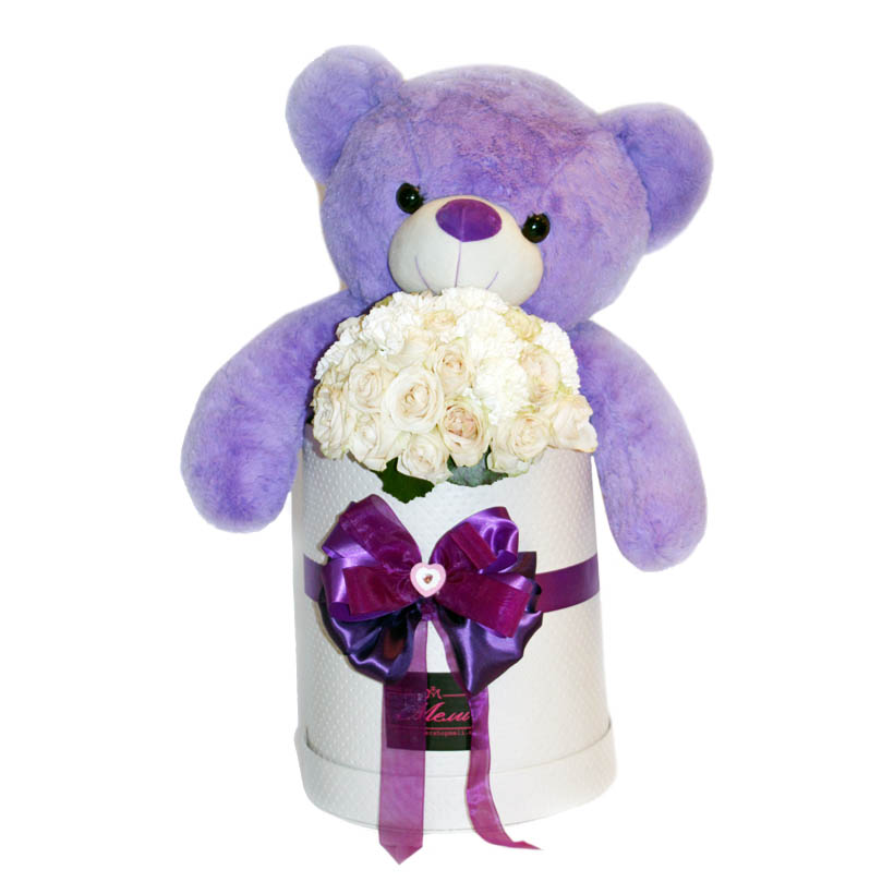 Jambo bear ,big flowerbox with roses and carnation and satin ribbon.